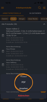 - Es besteht nun die Möglichkeit Arbeitsprotokolle direkt in der App als PDF-Datei zu exportieren und somit gleich per Mail zu verschicken, oder sich das Arbeitsprotokoll in der App anzusehen.