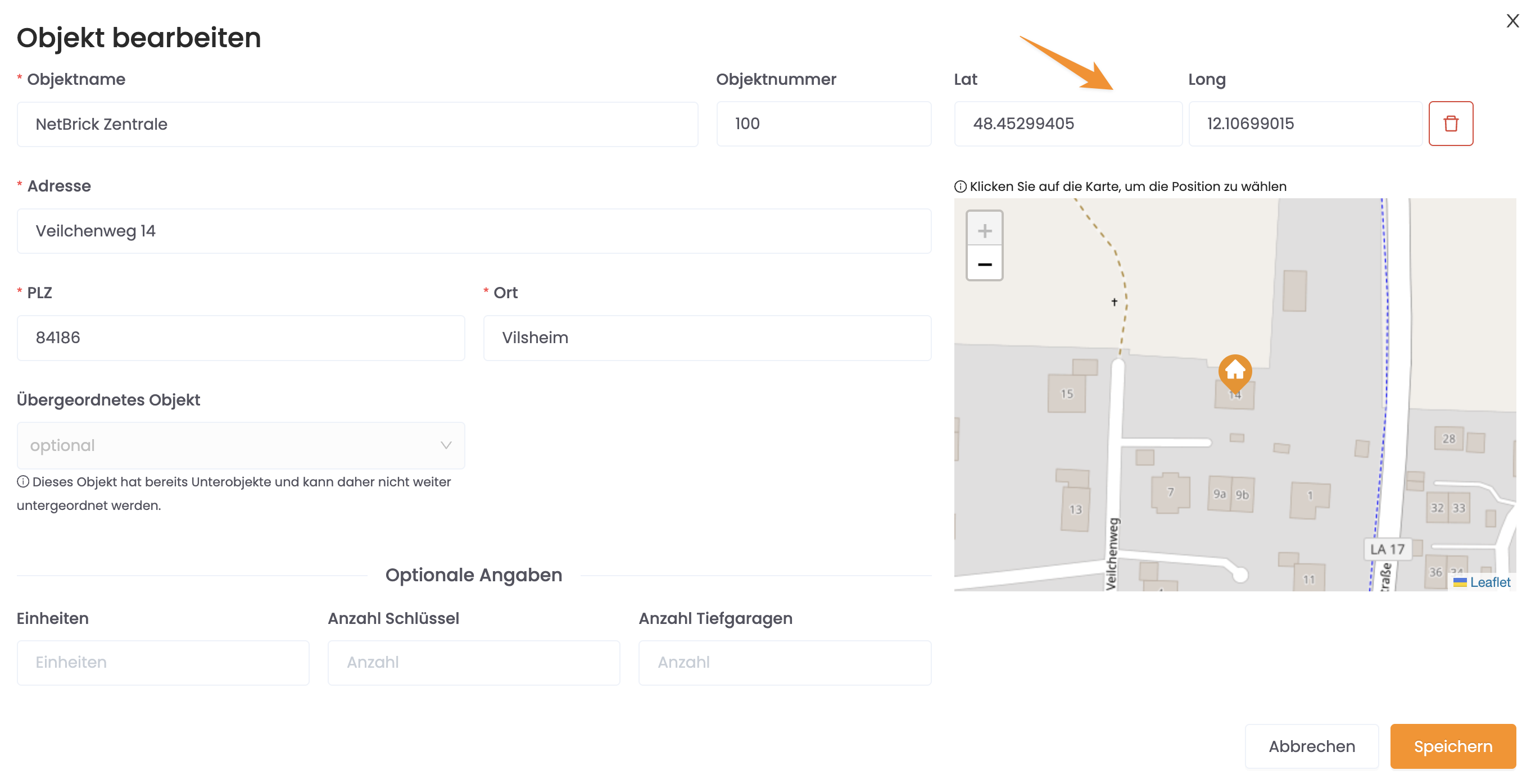Damit die App erkennen kann, wo sich das Objekt befindet, muss ein GPS-Standort hinterlegt sein.