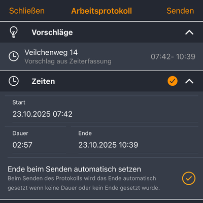 Wenn ein Arbeitsprotokoll erstellt wird und Sie zuvor in ein Objekt ein- und wieder ausgestempelt haben, wird die gestempelte Zeit automatisch unter den Vorschlägen angezeigt. Das spart Zeit bei der Dokumentation und sorgt dafür, dass alle erfassten Zeiten korrekt zugeordnet werden.