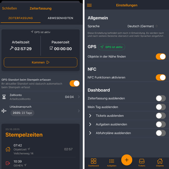 Mit dieser Funktion wird die Zeiterfassung präziser und effizienter. Dank GPS-gestützter Erkennung und automatischer Zuordnung behalten Sie stets den Überblick über alle Arbeitszeiten.
