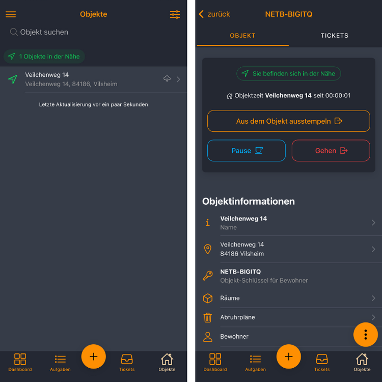 Öffnen Sie die mobile App und navigieren Sie zu „Objekte“.