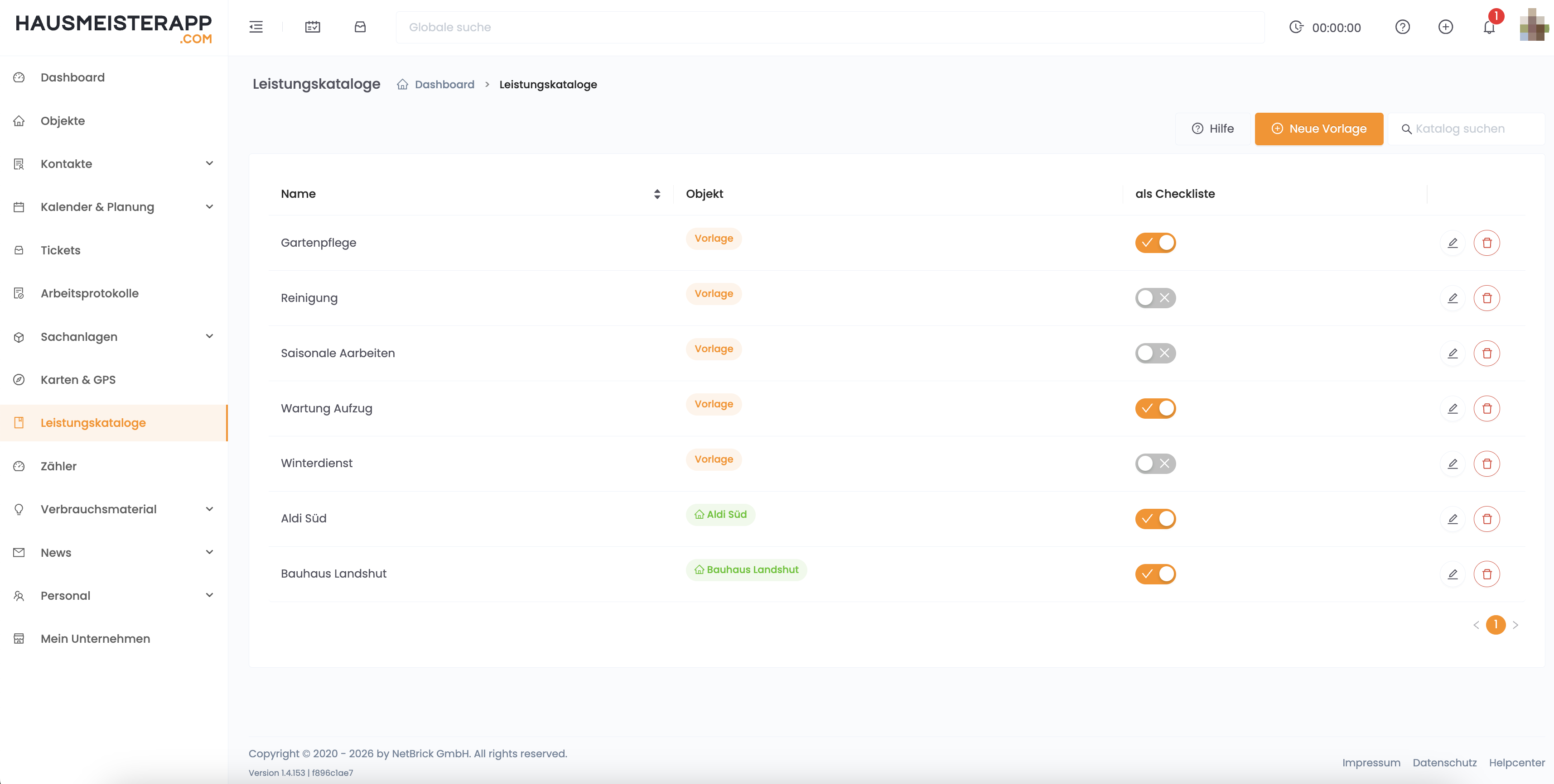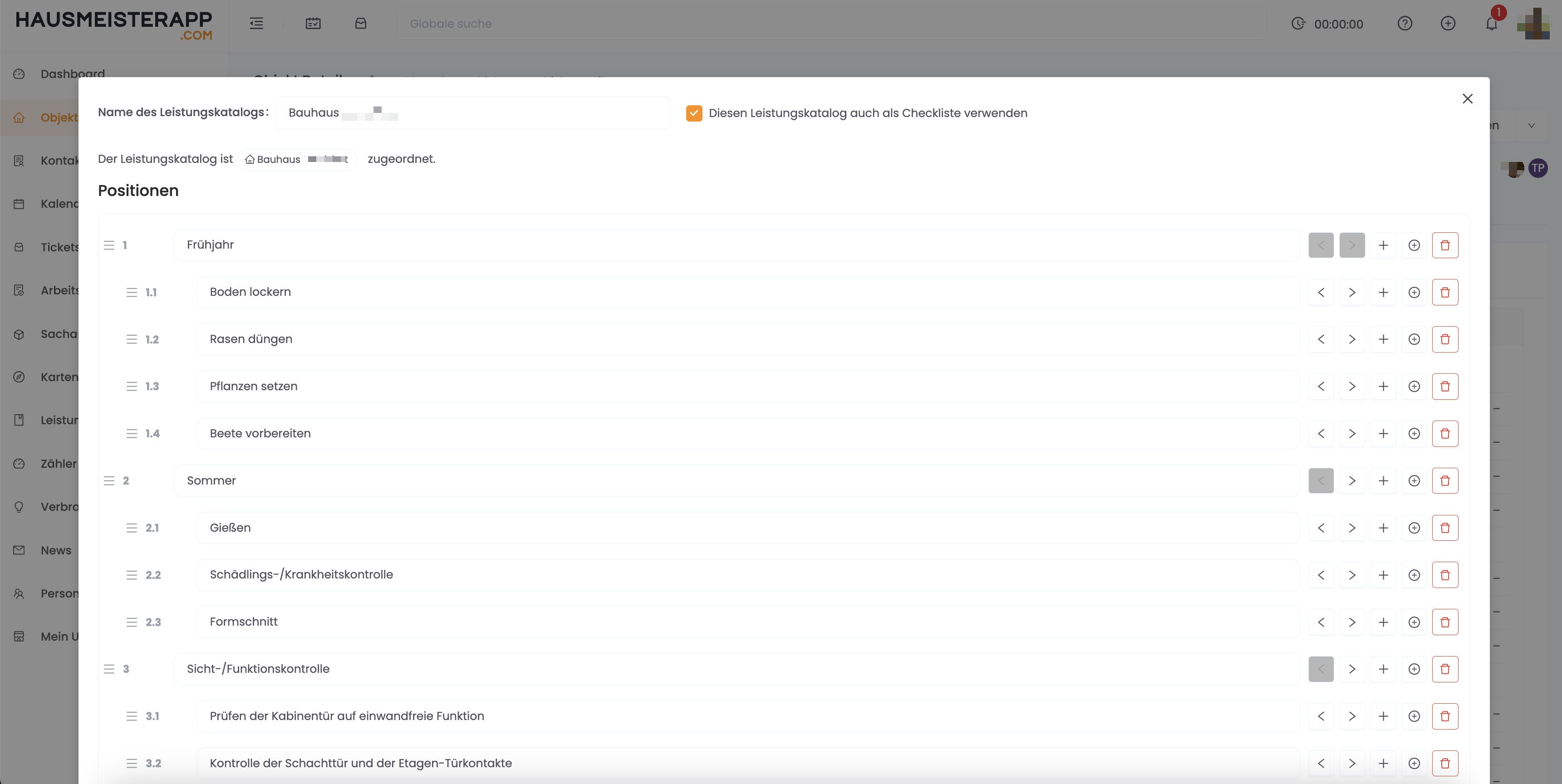 Die Leistungskataloge wurden erweitert und arbeiten jetzt mit einer 1:1-Beziehung zwischen Objekten und deren individuellen Leistungskatalogen. Alte Kataloge werden selbstverständlich übernommen, sind jedoch - wenn sie bei mehreren Objekten hinterlegt sind - mit einer Warnung versehen. Wenn man in einem Objekt etwas ändert, ändert sich das bei allen weiteren verknüpften Objekten mit.